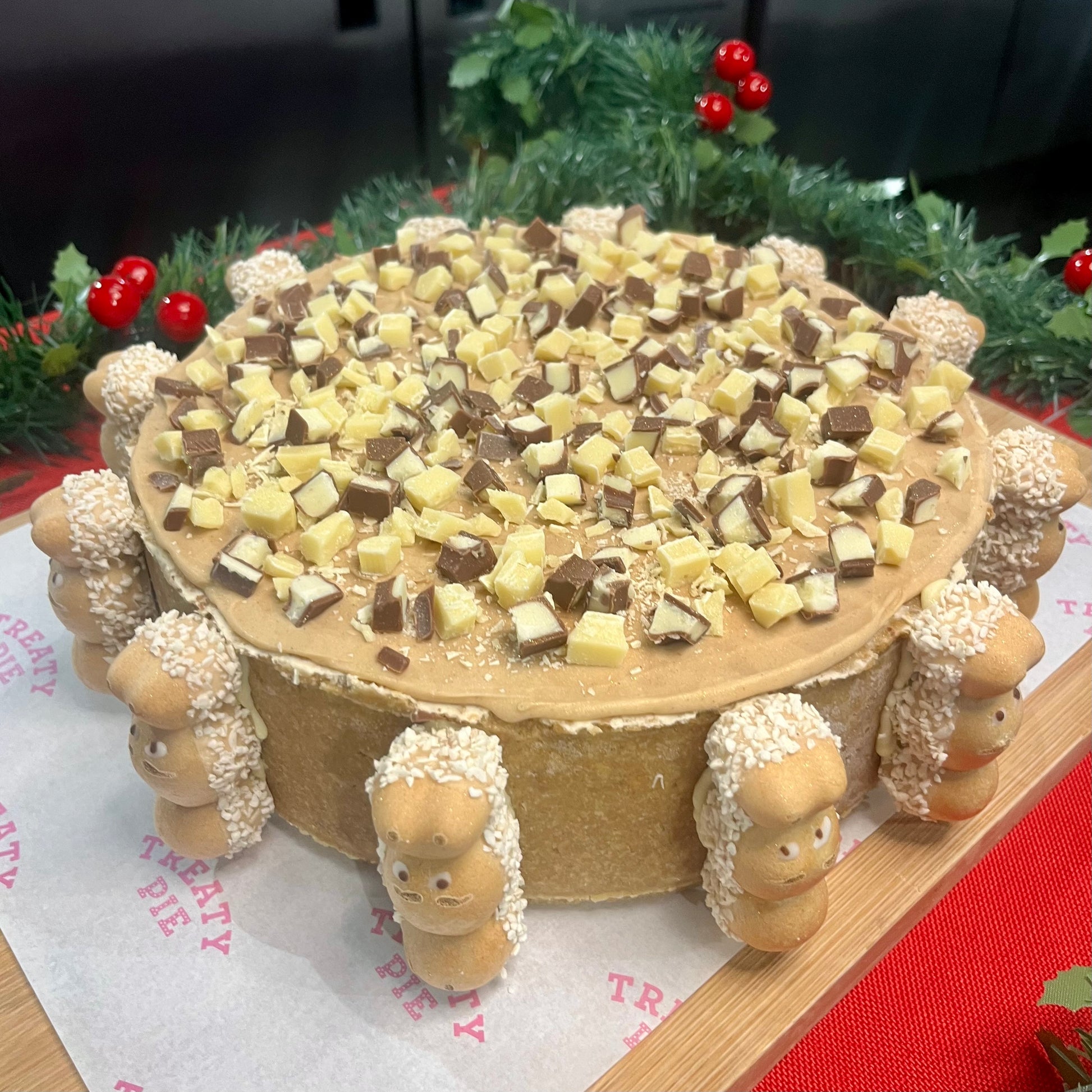 Digestive Biscuit Base, Kinder Cheesecake, Kinder Sauce, Kinder Chocolate, White Chocolate and Kinder Hippos.