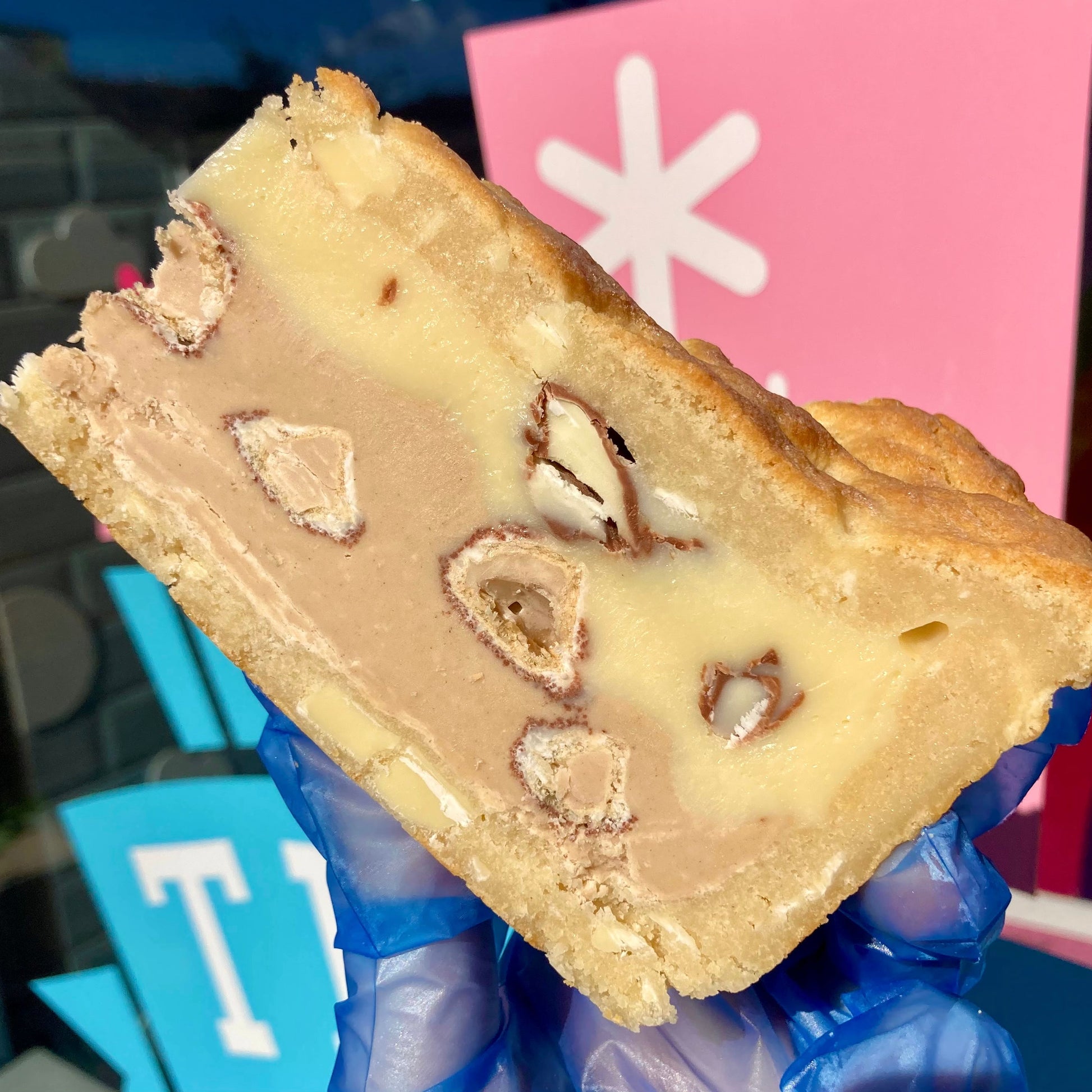 Kinder ganache, Milky Bar ganache, White Kinder Bueno and Kinder Chocolate all baked inside a White Chocolate Chip Cookie.
